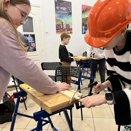 Zajęcia mają formę praktycznych warsztatów, podczas których dzieci od razu przechodzą do działania. Na początku poznają instrukcję, materiały i zasady bezpiecznej pracy z narzędziami. Następnie – krok po kroku – budują własne konstrukcje z desek, listewek, gwoździ i śrub, korzystając z przygotowanych skrzynek z narzędziami.